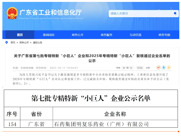 石藥明復(fù)樂榮獲國家專精特新“小巨人”企業(yè)稱號!